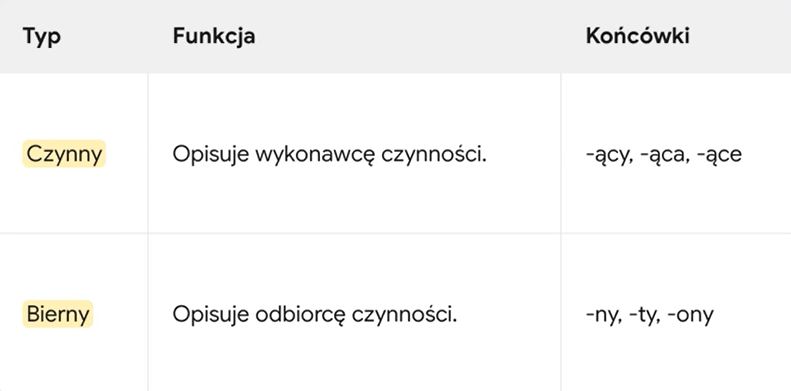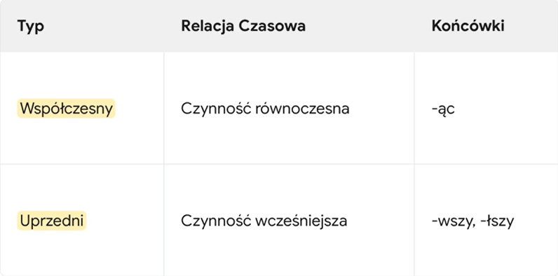 Te z kolei nie opisują rzeczowników, ale inne czynności, a ich super mocą jest pokazywanie relacji w czasie. Tutaj też mamy dwa typy. Pierwszy to imiesłów współczesny. Łatwo go poznać po końcówce –ąc. On krzyczy: dzieje się w tym samym czasie!