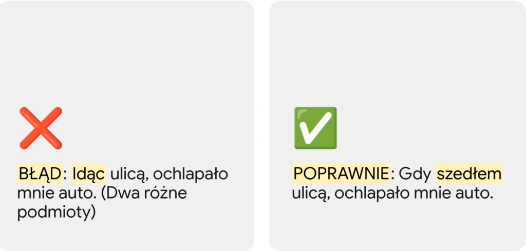 Idąc ulicą, ochlapało mnie auto. Brzmi dziwnie? No właśnie, bo kto szedł ulicą? No ja. A co ochlapało? Auto. Mamy dwóch różnych sprawców, a zasada mówi, że musi być jeden. Dlatego to zdanie jest po prostu błędne. Poprawnie będzie. Gdy szedłem ulicą, ochlapało mnie auto.